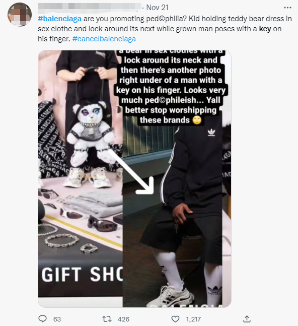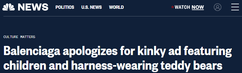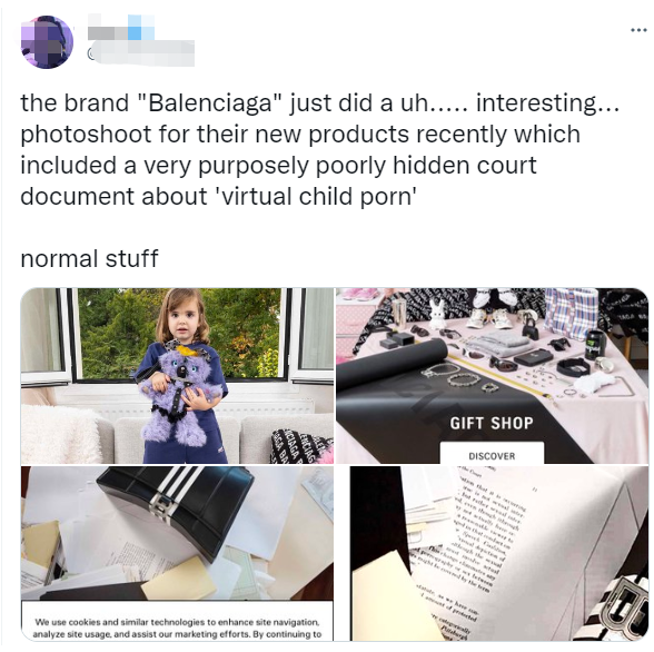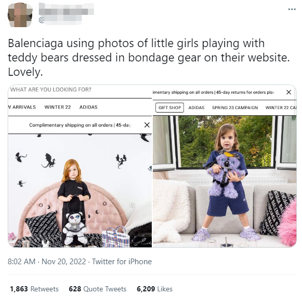 儿童模特手拿穿有捆绑、束缚道具的小熊出镜节日系列广告,包袋广告中出现美国最高法院一起关于未成年人色情制品的案件文件……因安插这些元素,奢侈品牌巴黎世家(Balenciaga)被质疑宣扬儿童色情,在国外社交平台遭到广泛抵制。