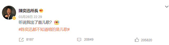 《孤勇者》在小学生中爆火也在原唱陈奕迅的意料之外,被网友笑称为“儿歌歌手”的陈奕迅发微博表示:“听说我出了首儿歌。”
