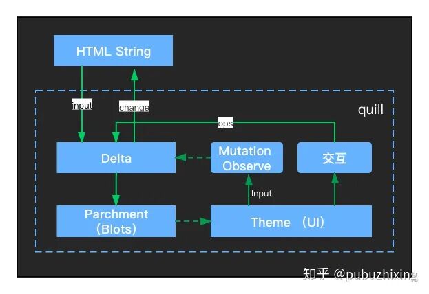 Quill.js 底层还是依赖DOM的contentEditable特性,但是Quill对DOM Tree以及数据的修改操作进行了抽象,这意味着编辑器开发者大部分场景下其实不是直接通过修改DOM完成编辑器功能的,而是通过Quill提供的模型操作API来完成操作的,主角变成了:Delta、Parchment & Blots。