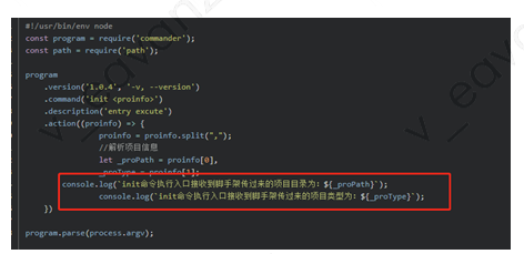 这里重点说一下我们的插件机制。插件本身就是一个可执行的命令工具,命令入口规定init,提供给脚手架调用 ,同时脚手架会给init传入项目的两个信息(后续会根据项目开发需求,可以放开更多的信息给插件使用),一个是项目类型的信息,一个项目的目录路径: