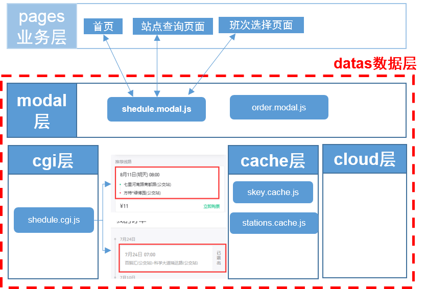 a、小程序项目业务数据在各个项目管理比较混乱,所以我们参考mvc框架,抽出数据层独立管理,内部按cgi、cache、cloud精细化数据管理维度,同时针对前端业务实体创建单例数据模型维度modal来简化不同页面共享数据状态的复杂度问题,用一张定制巴士小程序项目的数据管理datas层简图来描述一下: