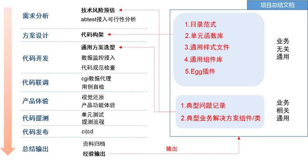我们将前端项目流程切分为需求分析、方案设计、开发、联调、体验、测试、发布、总结输出8个梯度。根据我们这边实际项目开发的一些工作细节(只做概论性总结,不深入讲解)进行整合归纳到8个不同的梯度中,为了起到流程的正向循环促进我们加入项目总结文档(一个以项目类型为维度进行经验收集管理的在线文档),每个项目在总结输出阶段开发负责人需要将项目遇到的一些业务无关通用性问题以及业务相关的通用方案,以及踩过的坑收集到项目总结文档中,提供给其他项目需求分析以及方案设计甚至开发阶段一个可借鉴的经验借鉴入口,用个简图概述一下: