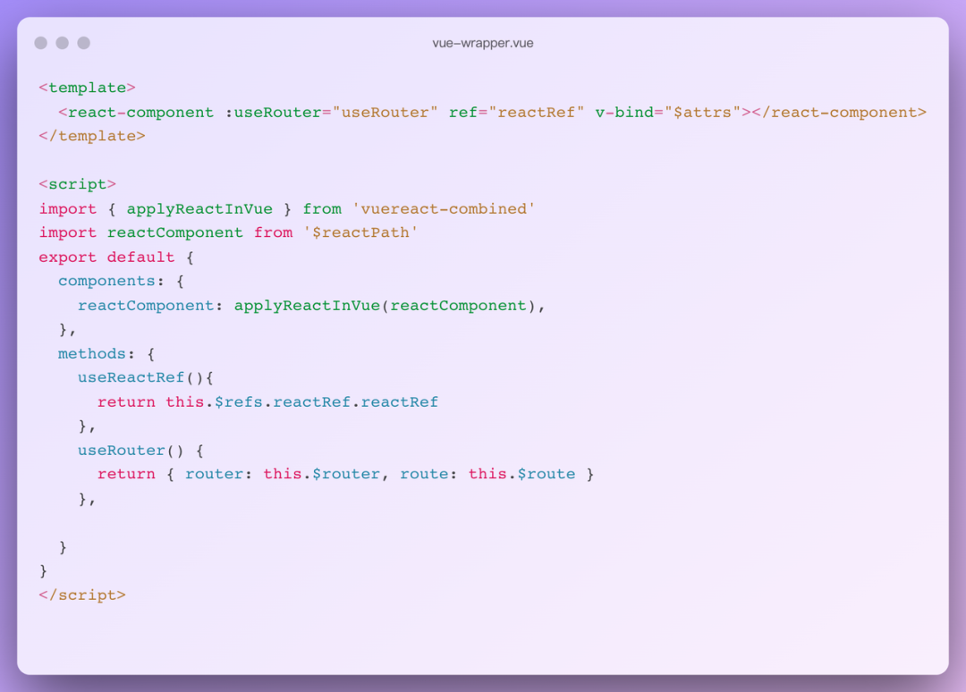 同时 vuereact-combined 内部还进行了 vuex、router 转化使得 react 组件可以获取到全局状态以及 router 实例以满足路由跳转以及鉴权相关需求。