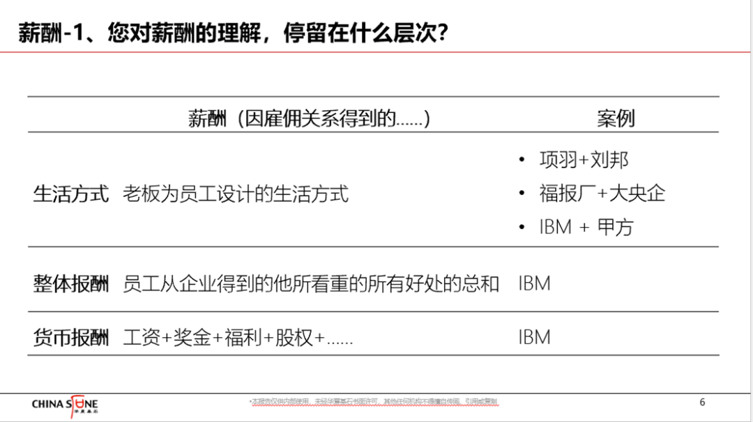 整体薪酬是员工从企业得到的、他所看重的所有好处的总和。狭义薪酬对应的英文是Compensation,背后的假设是工作是辛苦和烦人的,因为员工在工作中有很大的牺牲,所以企业必须给予相应的补偿,才能够诱发员工出工、出力、出活,这对应于人性假设中的X理论。整体薪酬的英文是total rewards,其中影响力最大的模型是世界薪酬协会给出的,包括狭义薪酬、工作场所中的好处、福利、发展、认可,如下图所示。工作场所中的好处具体包括文化氛围、社区参与、灵活工作、物理设施等。背后的假设是员工参加工作,除了钱之外,还有很多因素是也他很重要的,如果设计得好,能满足员工内在激励需求,那么工作将非但不烦人也不辛苦,反而能释放员工激情,其对应的人性假设中的Y理论和Z理论。上面讲的还是有些偏理论。接下来讲IBM的实践。笔者对IBM的薪酬管理,有一个评价,即“用二流的薪酬吸引一流的人才创造卓越的绩效”。这里有两个问题很重要,一是二流薪酬何以吸引一流人才——一流人才他们又不是不会算账。二是一流人才何以创造卓越绩效。第二个问题是组织管理要探讨的话题,这里不展开。接下来看,IBM用二流薪酬吸引一流人才的底层逻辑。如下图所示。前面讲IBM绩效管理演进史的时候,我们提到IBM员工工资的95%是固定、只有5%浮动。那么IBM靠什么激励员工?答案是整体薪酬。具体来说就是五个方面;一是基于业绩的机会,亦即员工看重的企业所拥有的各类机会的分配严格基于员工绩效,与领导的关系不重要,重要的是要有业绩和成果。二是领导力。IBM认为领导力就是影响力,不仅老板要有领导力,每个员工都要有领导力,所以员工在IBM有很多机会去培养和展现自己的领导力。三是多样化的人才团队,员工在IBM有机会和各行各业的顶级牛人打交道。四是灵活性,比如在家办公等。五是基于价值观的文化,即公司员工手册上所载的价值观就是公司所奉行的价值观,员工之间可以简单、透明地交往,没有那么多勾心斗角;不象潜规则很多的企业,员工得讲政治懂规矩,得花很多心思去揣摩领导内心真实的意图。把这五点加起来,IBM是给那让些不愿意唯唯诺诺、屈从于威权之下的人设计了一种收入虽然不是很高但却很有尊严且相对自由的生活方式。这种生活方式,吸引不了对钱和权非常看重的员工,但对那些有着自由情怀和追求思想独立的知识分子而言,却相当有吸引力。因此,在设计薪酬体系前企业必须想清楚以下几个问题:企业要吸引什么样的人才、这些人才为什么而来、企业凭什么吸引他们?这一系列的问题,统统指向了一个名词——价值主张。IBM的价值主张就是上图中的五条。这五条没有一条与钱有关,但是IBM依然能够吸引到大量的优秀人才,就是因为IBM设计的整体薪酬与其所要吸引的人才是匹配的。上面这张图,左图是IBM 2007年的人力资源战略,右图是IBM 2011年的人力资源战略,虽然表述不一,核心的要点都是通过整体薪酬释放员工潜能进行创造卓越绩效。2012年罗睿兰就任CEO之后,开启了IBM的企业数字化转型之旅。这个阶段IBM人力资源管理在整体薪酬上,更加强调由在线且实时赋能的数字化工作场所和因需而应且实时在线的数字化学习引致出来的员工体验。与之相适应的,IBM人力资源部门也旗帜鲜明地提出,人力资源部门应当成为员工体验的监护官。总结。数字化时代下的薪酬管理,可从以下三个角度把握:- 从薪酬哲学上讲,把薪酬外延从狭义薪酬拓展到整体薪酬再到生活方式的背后,是视员工为从工具到目的,通过满足员工内外两方面的激励需求而更好激发员工主动性,释放员工潜能。