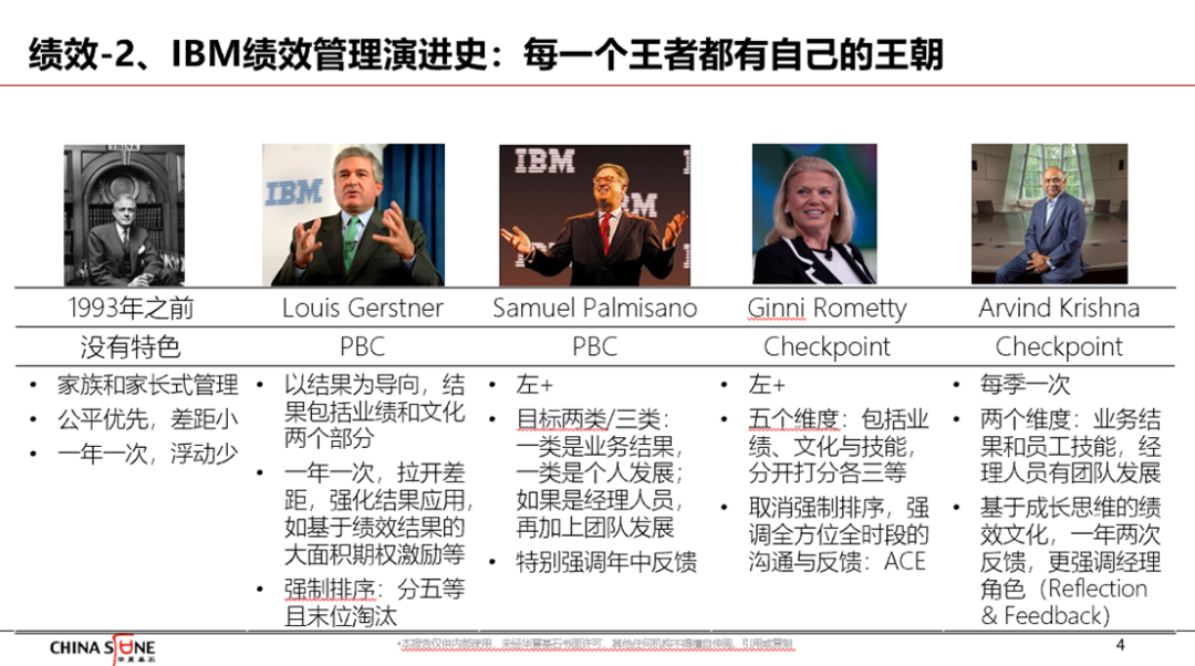 虽然组织绩效管理是绩效管理的重要组成部分,但是全球90%以上非中方背景的世界500强企业中,组织绩效由财务部门负责,而人力资源管理部门主要承担员工绩效管理,而且即使是员工绩效管理,人力资源部门也不是第一责任者,第一责任者是直线经理。上面讲的有些抽象,接下来讲IBM过去30年的绩效管理演进,如下图所示。1993年之前,IBM属于典型的家长式管理风格,所以有人开玩笑说,IBM是全球最大的国企之一。这个阶段绩效管理的特征是:公平优先,差距很小;一年一次,活动很少。浮动少到什么程度?大概只有5%的浮动率。假定一个顾问年薪是10万元,其中真正浮动的,平均在5000元左右;当然销售线浮动比例会高一些,但一般也不超过30%。郭士纳阶段。郭士纳既是管理大师,同时也是一位战略大师。他把PDCA的管理原则导入IBM并创立了PBC的绩效管理模式,考核业绩结果和文化认同。为什么需要加入文化?因为在郭士纳看来,IBM转型的要点和难点是企业文化的转型。如果文化转型不能与员工绩效挂钩,那么就起不到实质性的作用。这样,IBM绩效管理的特征可以概括如下:一年一次,拉开差距;强制排序,分为五等,末位淘汰;强化结果应用,如基于绩效结果的大面积期权激励等。事实上,杰克·韦尔奇在GE也做了差不多相同的事——20%优秀、70%合格、10%淘汰。这是大部分企业的绩效管理普遍采用的方法,包括微软在内。郭士纳后,IBM迎来了彭明盛时代。彭明盛是郭士纳的忠粉,他执政时代可用萧规曹随来形容,绩效管理整体变化不大,只是更加强调年中反馈——实践中做的好不好另当别论。2012年,Ginni Rometty(罗睿兰)走马上任,她为IBM的绩效管理带来了三个变化:一是五个维度,包括业绩、技能和文化中的成就客户、创新为要和诚信负责,每个维度分三等,分开打分。二是取消强制排序,因为每个维度单独打分,也没有汇总,强制排序也就取消了。在同期或更早些,微软等企业也取消了强制排序。说明大家都已经意识到,强制排序刚引入时有好处,但时间久了会有很严重的负面效果——如加速内卷、破坏信任、相互不协作等。三是强调全方位、全时段的沟通与反馈,借着数字化东风,引入了ACE工具。简单地说,ACE是一个互相点赞平台,即每个员工在考核周期内都有一个分值,来自上下级和同事的“赞”会使这个分值变得更高——分值越高代表其在同事心目中的评价越好。这个工具的好处在于,以前员工之间相互欣赏,或者说员工在群体中的品牌和口碑,组织并不知道。通过ACE工具一方面把之前看不见的信息透明化,另一方面是促进团队内部的相互认可、改进团队氛围。当前,IBM的首席执行官是来自印度的Arvind Krishna博士。他为IBM的绩效管理带来了两个变化:一是周期缩短,从一年一次变成一个季度一次。二是从业务结果和员工技能两个维度对员工进行考核,经理人员有团队发展维度。我们会发现,对文化的考核已经随着罗女士的卸任而消失了,变成了基于成长思维的绩效文化,一年两次的反馈,更强调经理的角色(Reflection & Feedback),说明IBM真正回归到了“绩效好不好,关键是领导”的境界。IBM绩效管理的变革或演进史,在一定程度上代表了美国大企业绩效管理演化的思路和历史。我们不妨把绩效管理的演变简化分为两个阶段,即过去以操作类员工为主体的绩效管理和现在以知识型员工为主体的绩效管理。下面,我们从假设、追求、规则、主角、工具五个方面对比和解读这两个阶段的绩效管理。任何一种管理都是基于假设的。任正非说,他最大的权力是思想权和文化权。但是在思想权和文化权的背后,是假设和假设权。在操作型员工为主体的时代,人们普遍认为绩效是被激励出来的,以斯金纳的操作理论为假设基石。该理论把员工当成黑箱,管理者无须关注“黑箱”的构造及作用机理,只要操控输入以及基于结果的赏罚与激励,就能使“黑箱”输出组织想要的结果。在这样的假设下,绩效管理追求的是以企业为中心的目标达成。在以企业为中心的目标达成的追求下,绩效管理的规则是基于实力与地位的丛林法则。老板是老大,员工业绩不行是员工不行,而不是老板不行,末位淘汰也应运而生且合理。绩效管理的主角包括员工、人力资源管理人员和直线经理,虽然也强调以人为本,但是以人当“本钱”的工具思维。人力资源管理人员则交付简单的规则和流程,如绩效考核管理办法、奖励和淘汰比例等。直线经理则被动地严格按照人力资源部交付的规则和政策进行考核,并且要做到流程透明。数字化时代的绩效管理什么样呢?首先,基本假设是,绩效是被催生或者是被孕育出来的。惠普的“车库文化”就是这一假设的成功实践。惠普创始人有一个深层假设,即在企业只要搭建起良好的环境后,好的绩效结果就会自然产生。在该假设之下,组织的追求是企业和员工的共生共荣,所以在绩效管理中,既有企业希望得到的业绩结果,也有员工看重的技能成长。与之相适应的绩效管理规则,越来越强调经理人的责任和领导力,领导者的责任是搭建一个能让善和潜能等人性光辉面能被自然而然释放和激发出来的环境与氛围,让员工在这样的环境中施展和成长。绩效管理的主角,第一个就是员工:舞台由企业和经理人员搭建,员工在台上表现好坏的第一责任者是自己。人力资源管理部门的主要职责,概括起来讲有三个,面向经理