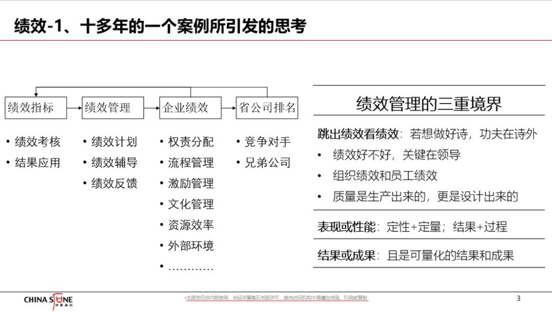 2009年,我曾服务于中国移动的一个分公司,这家分公司的老总是省公司的后备干部。2006年前后,他带领这家分公司创造了非常优秀的业绩,每季度都处于前三的位置。但是,从2008年开始,业绩排名突然下滑到了七八位,甚至还倒数第一。作为后备干部,他断不能接受这样的结果,第一反应是绩效考核出了问题。于是聘请了一家咨询公司,提炼优化考核指标并将考核结果与奖金挂钩。折腾了三个月,没有产生效果。这时,他们找到了我。经过调研,我发现两个事情,一是这家分公司的绩效考核其实做得很好,举个例子,即使是营业厅最基层的员工,其月考核指标就有三十几个,而且每个指标的分值、计算方法和考核办法也标注得非常清晰和详尽。当然你可以基于书本理论讲,考核指标太多,KPI变PI。首先,KPI变PI是不是一定就能解决问题,真不好说。因为他们之前一直就这么干的,那个时候的绩效很好;不只是他们这么干,兄弟移动公司基本也这么做。二是有一次到营业厅调研,冬天天气很冷,营业厅暖气已经坏了一个多月,员工个个穿着厚厚的棉大衣瑟瑟发抖。我问这个老总,在这样的情况下,您觉得用惩罚就能激起一个月就拿2000多元工资的派遣制员工用心服务客户?在这种情况下,把精力放在指标增减和结果应用上,无异于用物质奖罚去管理高三学生的成绩,虽偶尔可能会有效,但大概率是没用。后来我给出的建议是:要改善排名,工夫在诗外,逻辑见左下图。这个案例引发了我的思考。我们对于绩效的认知有三重境界。第一重境界是结果或成果,而且是可量化的结果或成果。卡普兰讲,凡是不能量化,就不能管理,这句话至今仍被奉为金科玉律。而绩效的英文是Performance,其原本的含义是对表现或者性能,性能好理解,表现是什么?表现是员工在企业给其提供的舞台上的演出。第二重境界是定性加定量、结果加过程的综合。凡是本质都难以量化,凡是能够量化的都非本质,而决定事物发展趋势的当然不是表象而是本质。第三重境界,就是要跳出绩效看绩效,要想提高绩效,功夫在绩效之外。包括三点:- 绩效好不好,关键在领导。与之相关的,是现在绩效管理都特别强调绩效文化和绩效领导力。