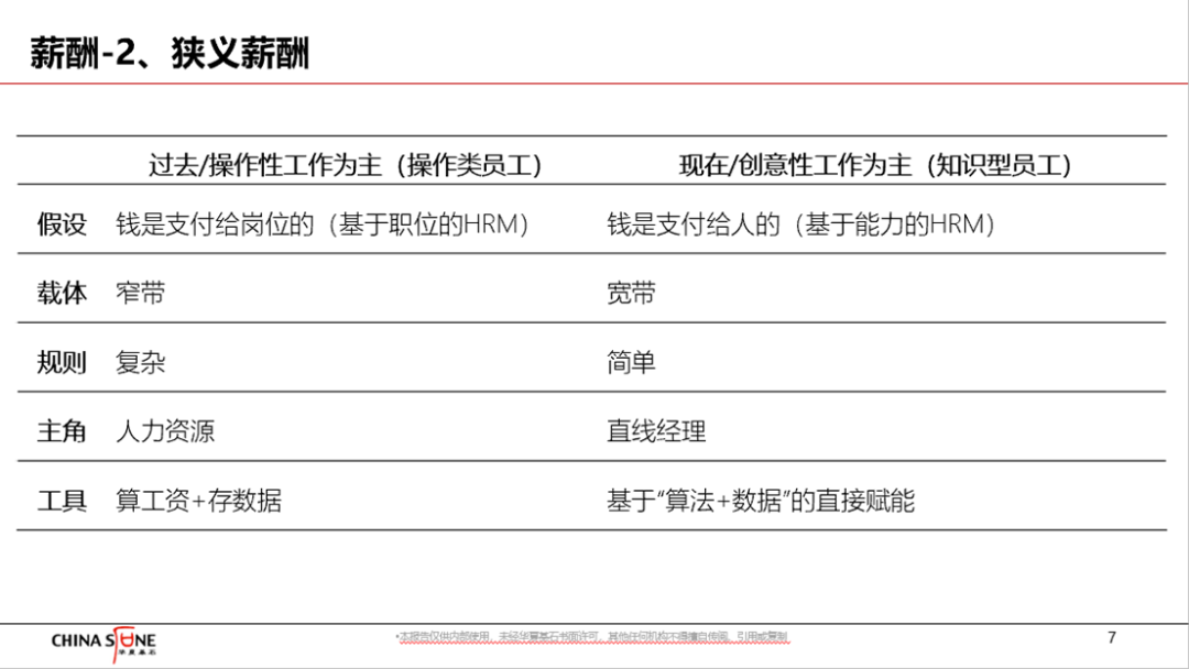 - 从管理工具上讲,在传统流程信息化的基础上,更多强调把薪酬专家的经验与算法固化为平台算法实时赋能直线经理,强调从数据洞察员工需求与离职倾向进而主动激励和留人。