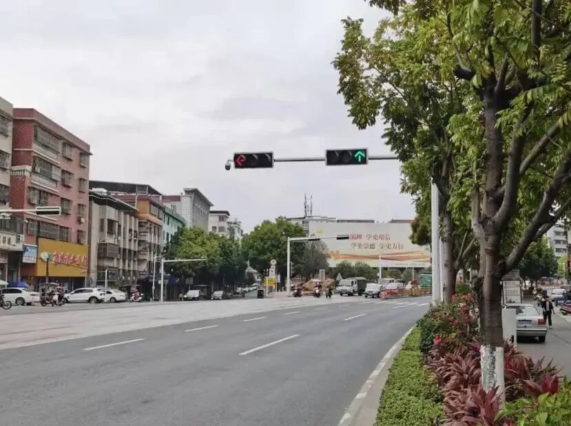 为缓解蕉岭县辖区道路特别是货车国道穿城时段交通拥堵情况,公安交警部门对205国道逢甲公园路口红绿灯的通行时间作部分调整。在上图红绿灯信号时,车辆只能直行,不能左转。请左转往南门路、东福街行驶的驾驶员,按照车道标线指引提前变更到左转弯车道,请勿随意变道。