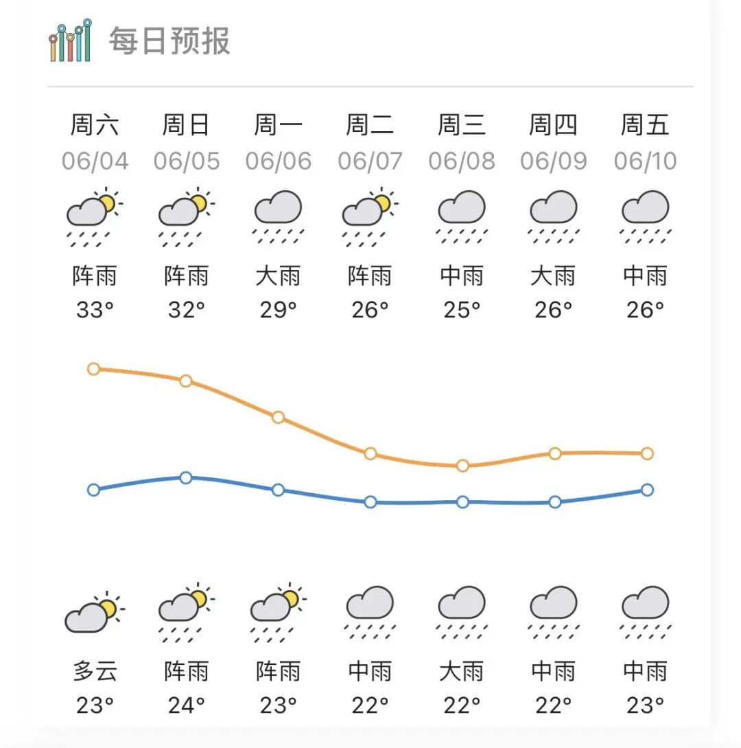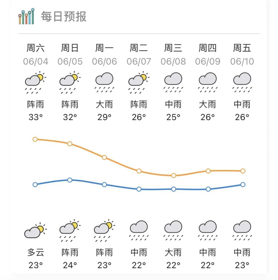 6月5日:有雷阵雨,局部大雨,气温24至33℃;