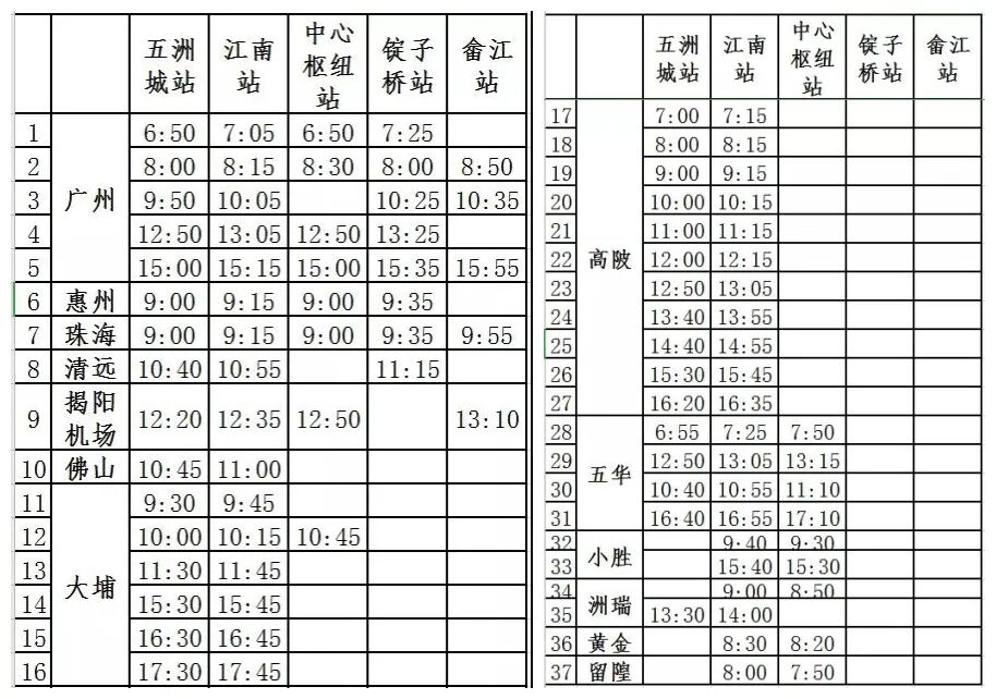 班车方面,梅州城区前往广州、惠州、珠海、清远、佛山、揭阳潮汕机场等方向的市际班车,以及前往大埔、高陂、洲瑞、五华、小胜、黄金、留隍等市内班车,都将在江南招呼站停车配客。
