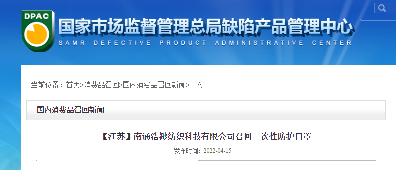国家市场监督管理总局缺陷产品管理中心网站信息显示,日前,南通浩渺纺织科技有限公司按照《消费品召回管理暂行规定》的要求,主动向江苏省市场监督管理局和南通市市场监督管理局报告了召回计划,将自即日起,召回2020年3月4日至2020年4月24日期间制造的一次性防护口罩,涉及数量为200包(50个一包)。