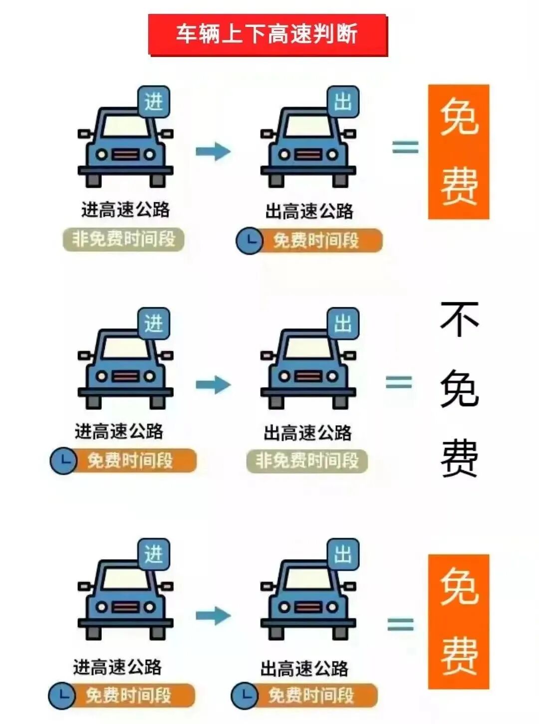 ★ 注意:免通期间计费以车辆驶离高速收费站出口时间为准,在收费期间上高速公路,免费期间下高速公路是不会被收费的,大家不需要在收费站口等待零点到来。