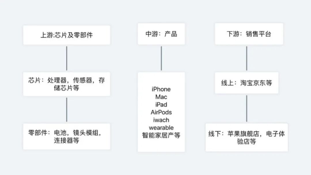 苹果产业链上游是研发设计,如一些核心芯片及核心零部件;中游为产品制造;下游为品牌运作等销售平台。苹果的成功就在于把握了最重要的两头,即设计研发和品牌运作,而将中间的产品制造全部外包。
