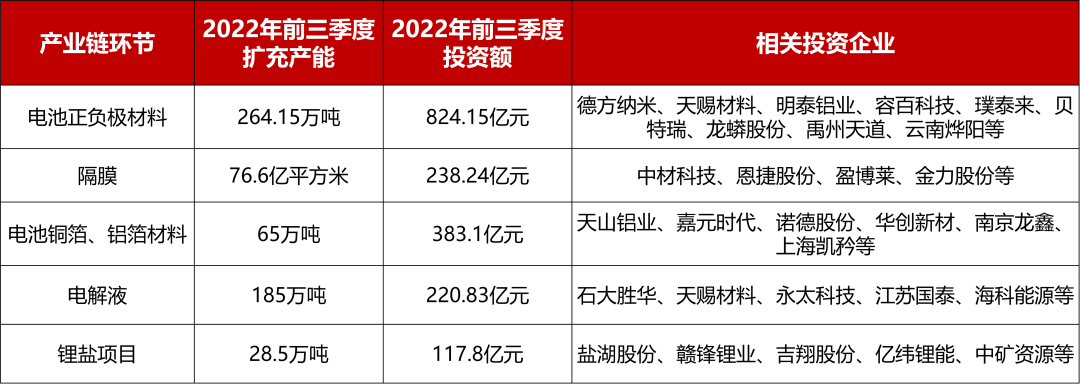 ▍表2:2022年前三季度锂电池各环节扩建产能及投资额