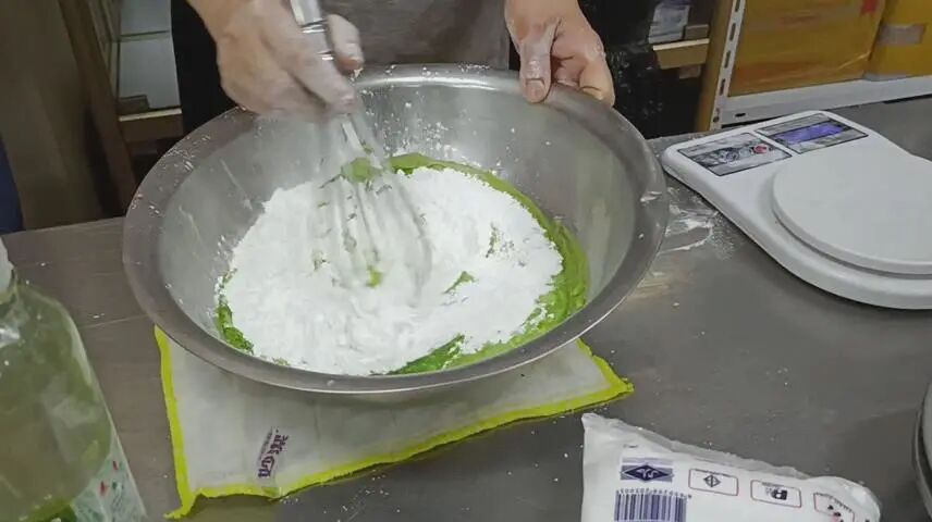 在盆中倒入糯米粉250g、澄粉25g、麦芽糖适量、艾青汁150g、牛奶50g,搅拌均匀。