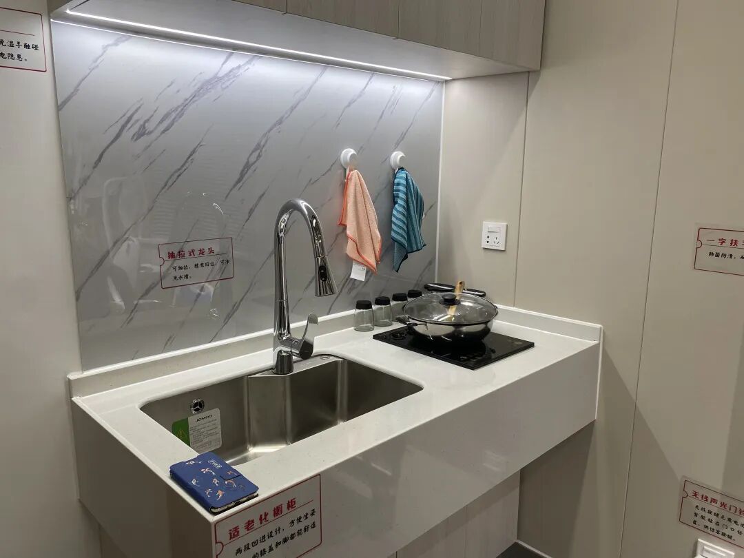 样板间设立在曲阳路街道市民驿站延伸点内,打造了厨房、卫生间、卧室等场景,每个场景里装有基础包和个性包内所有可供老人选择的设备。