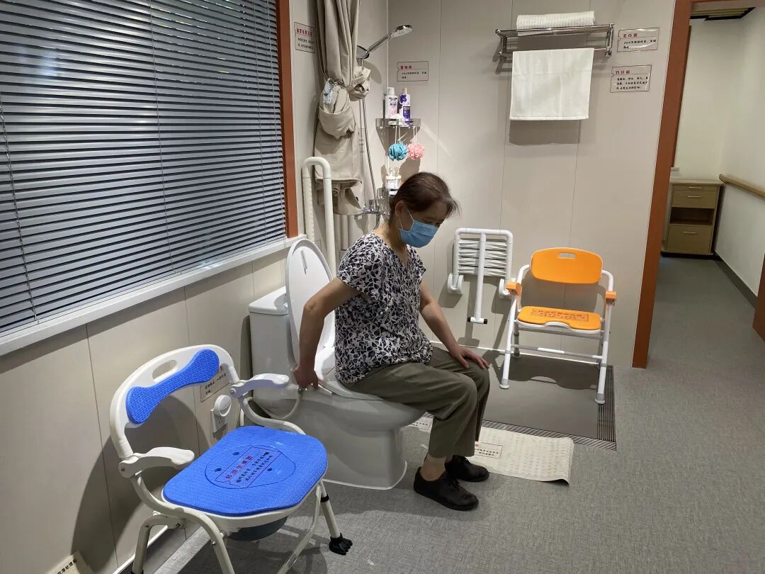 “阿婆,您看这个盖子可以拿下来的,不用的时候再把盖子盖上,看上去就是一张普通的凳子。”工作人员正在给前来参观的居民陈阿婆介绍适老化改造项目中的一个设备——移动坐便器。
