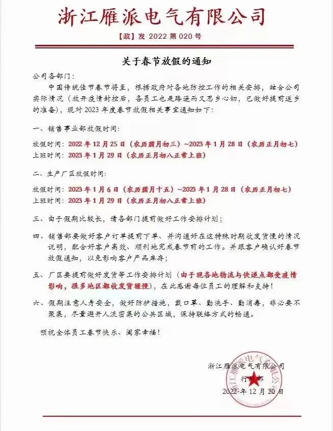 销售事业部放假时间: 2022年12月25日(农历腊月初三)—2023年1月28日(农历正月初七);上班时间为2023年1月29日(农历正月初八正常上班)。