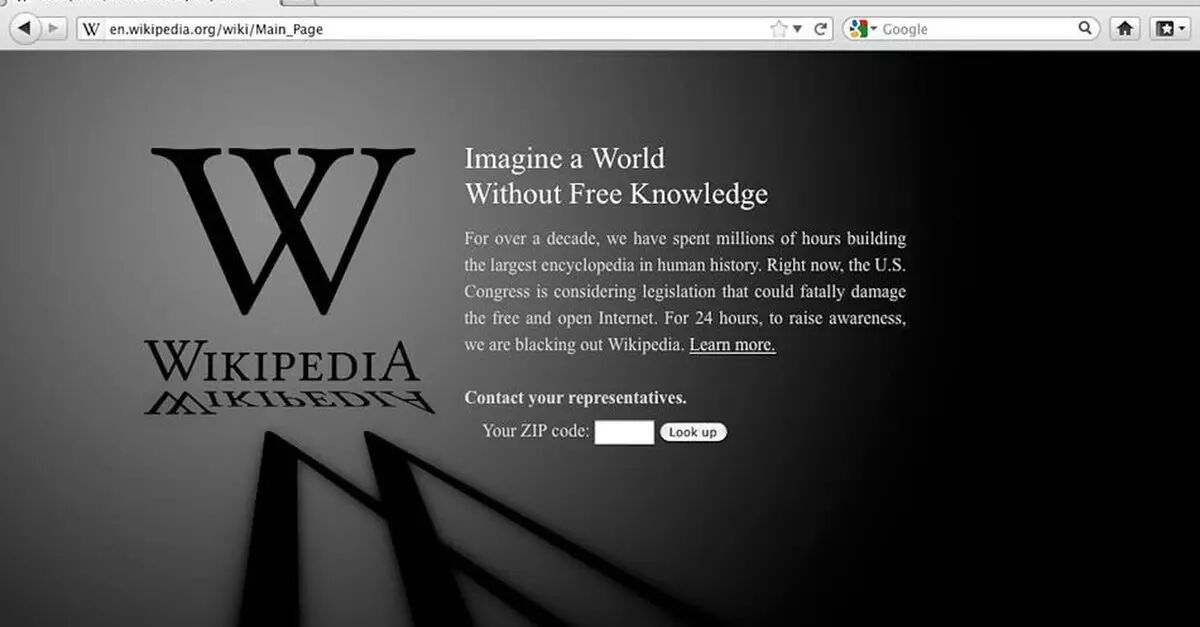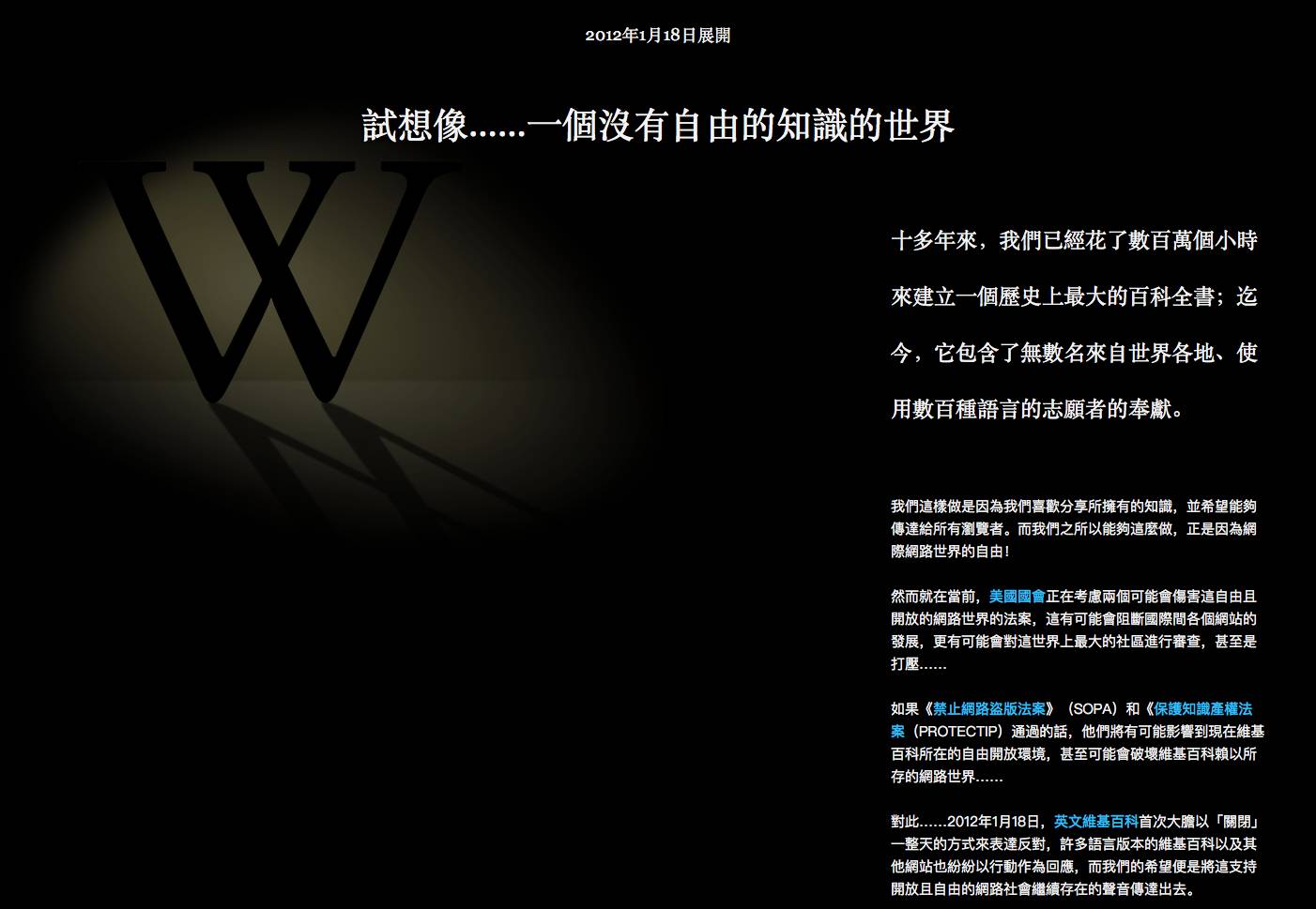 图3,2012年1月18日,维基百科全站停止访问一天抗议,这是当天唯一能访问的页面。中文版见下面这张: