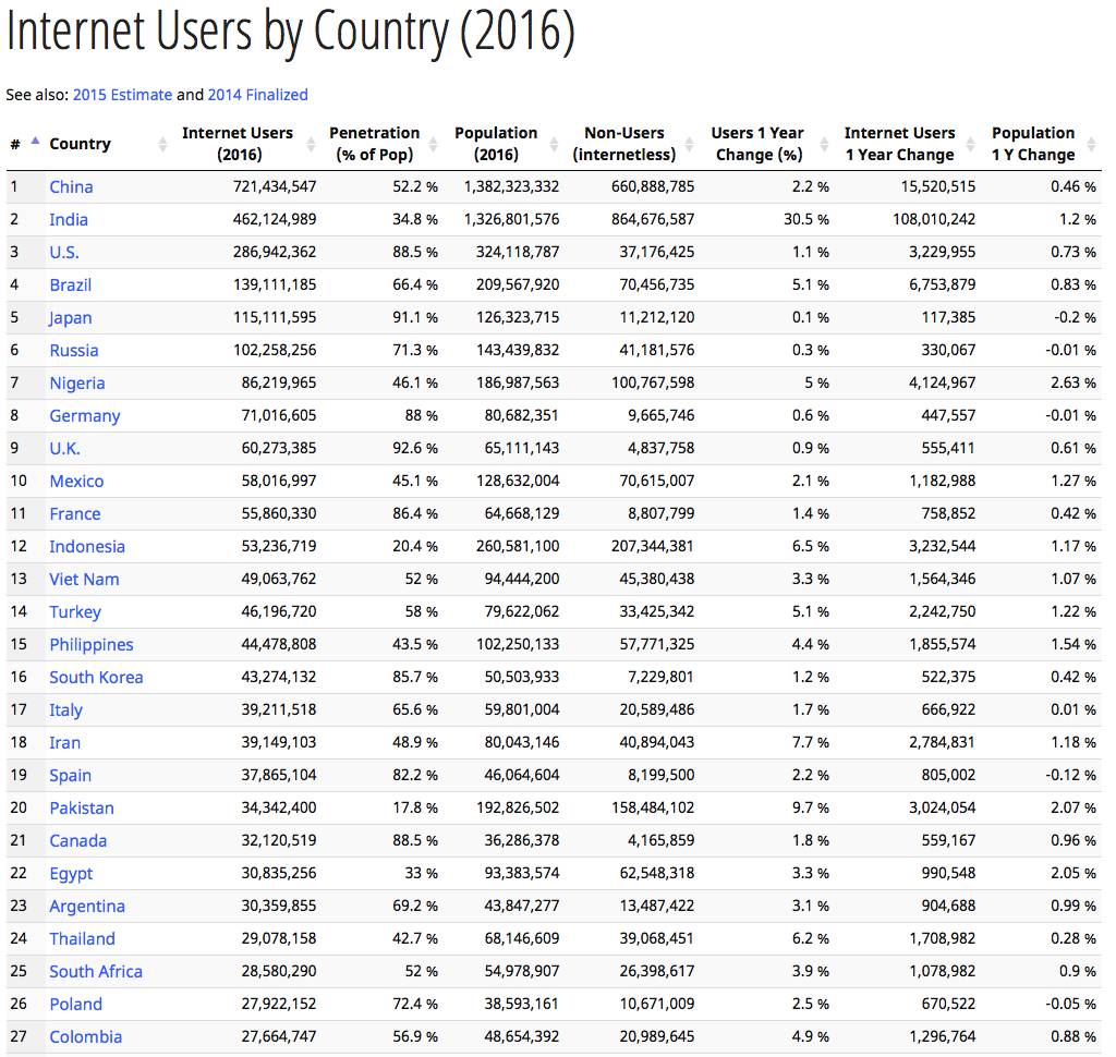 先来看好消息。好消息是互联网用户数未来仍然会有很大增长空间,虽然可能增加起来难度比过去大。到2016年,整个国家100%人口都联网的只有一个国家,冰岛。其他发达国家,基本都在90%上下,而中国才刚刚超过50%,被认为下一个增长点的印尼,仅有20%多一点。