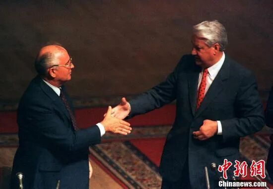 1991年8月23日,戈尔巴乔夫与叶利钦握手。