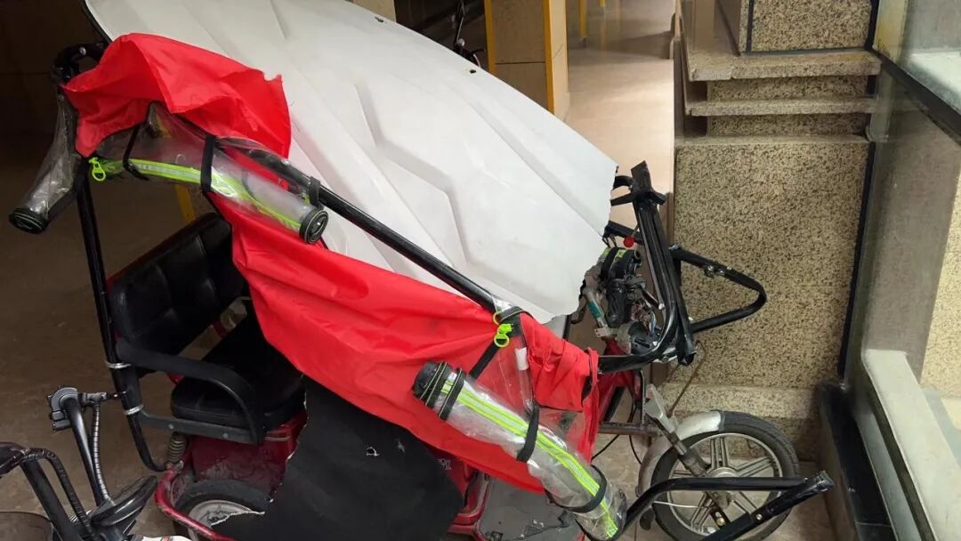 在单元架空层,记者看到了被砸中的电动三轮车,车子加装的顶棚已经变形塌陷,黑色金属框架已经弯折,可以想见当时坠落下来的冲击力。