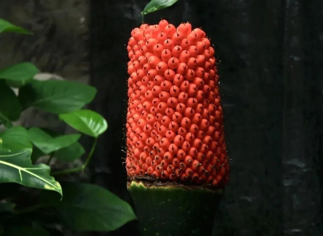 近日,国家植物园两株火红的巨魔芋首次结实。