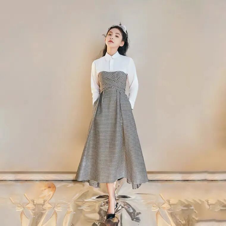 衬衣拼接式的连衣裙,整体风格偏日常,不会太夸张,方便各种场合的穿搭。