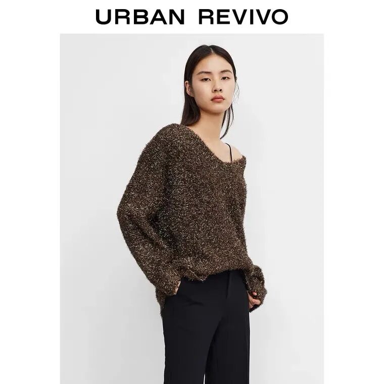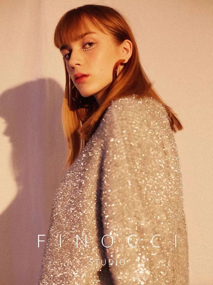 闪闪发光的长毛绒针织开衫和裙子的套装,整套穿在身上有着金光闪闪的华丽感。