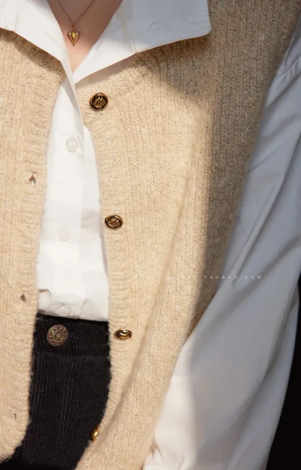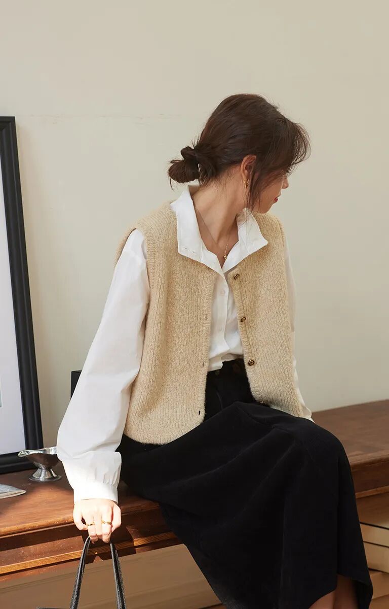 例如一件简简单单的燕麦色毛衣马甲,搭配白衬衫和中长款黑色半裙,温和又正式。