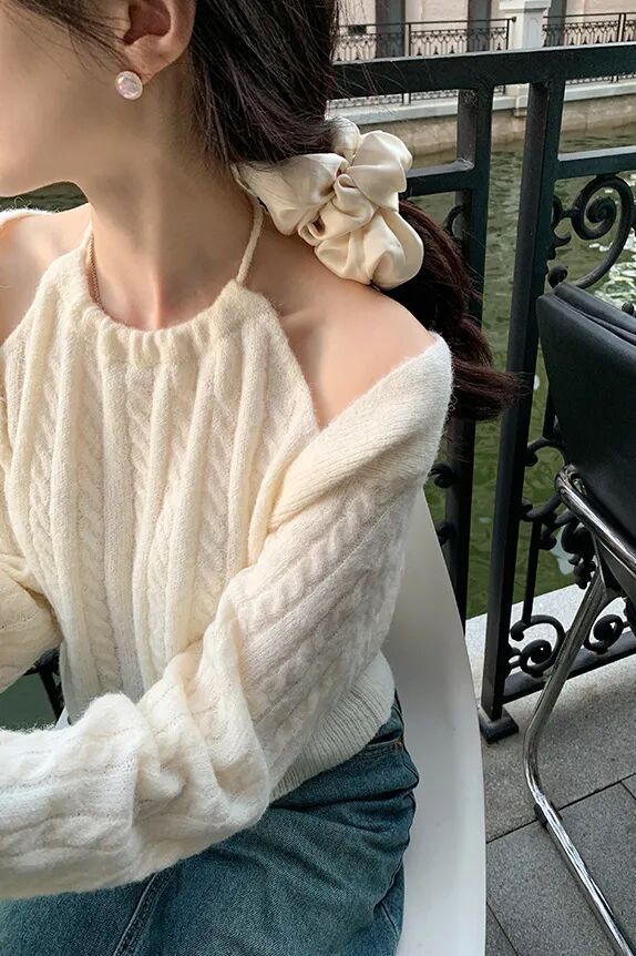 软嫩嫩的挂脖露肩毛衣,直接就是纯欲氛围感拉满了!