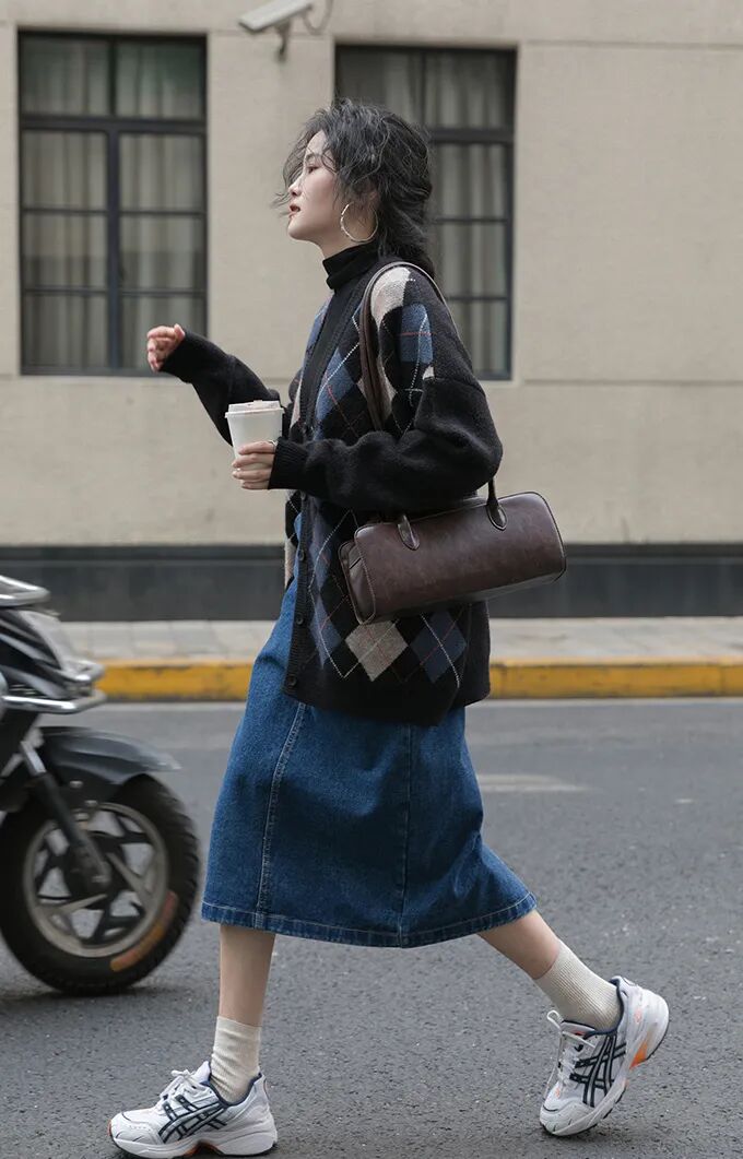 下装搭配一件牛仔半身裙,用硬朗英气的版型中和毛衣的妩媚,达到「曲直平衡」的效果。