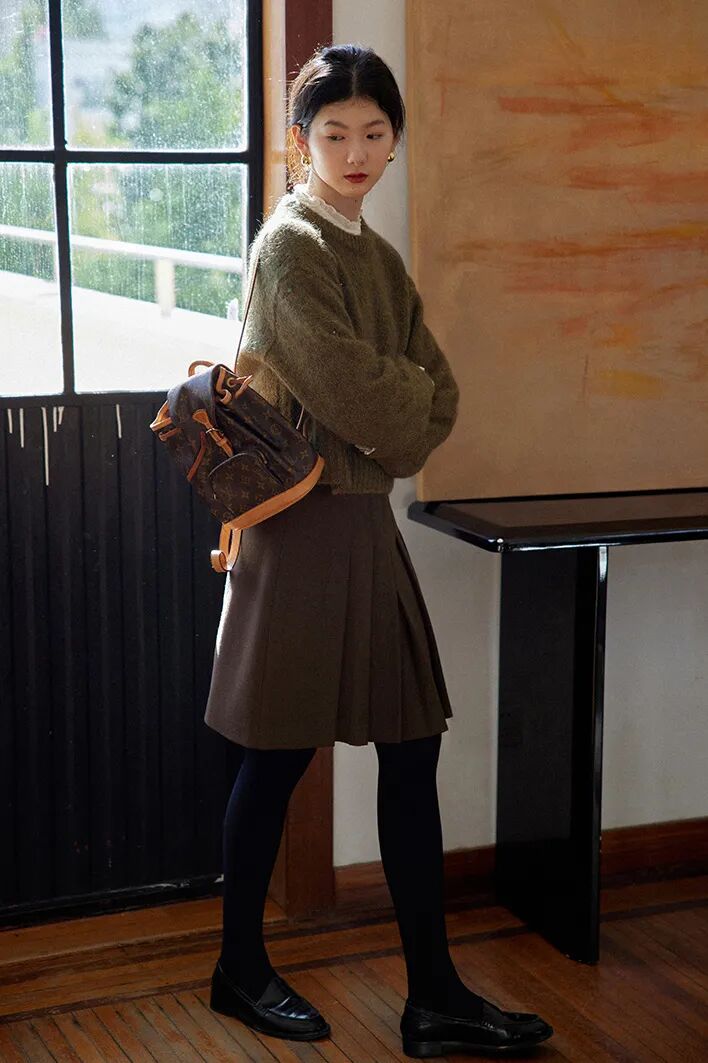 咸菜绿和秋冬季节的适配度也是巨高,搭配格纹半裙,复古温柔,气质满分。