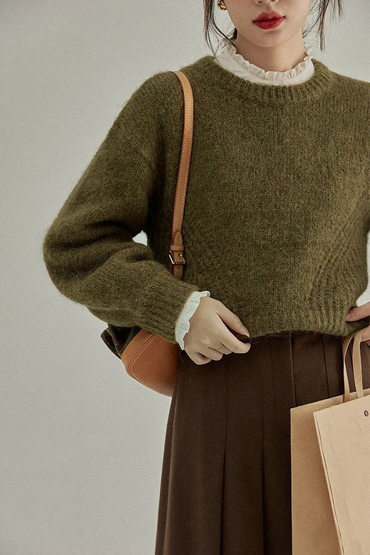 小领口的套头毛衣就比较精致了,橄榄绿配色也会增加复古优雅的感觉。