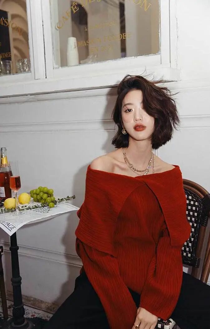 如果是出席晚宴,推荐姐妹们试试这种不对称设计的大翻领毛衣。轻松凸显肩颈线条,穿法也很多样。