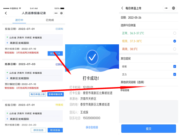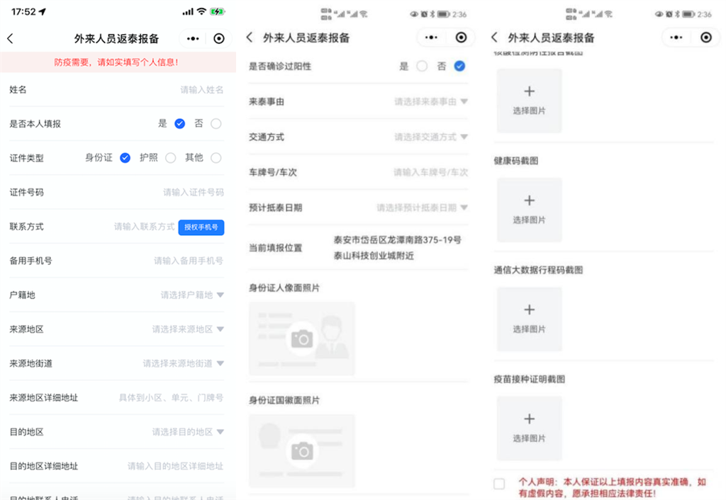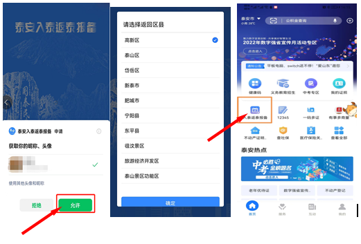 泰安市入泰返泰报备小程序设置两种登录方式:小程序搜索框中录入“泰安入泰返泰报备”或 扫描小程序二维码,或登录“爱山东APP”,选在泰安厅搜索泰安入泰返泰报备,授权登录后选择需要报备返回的区县即可。