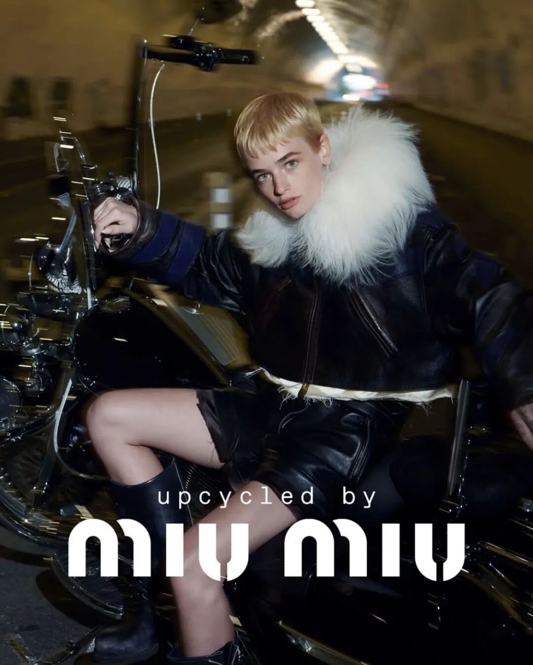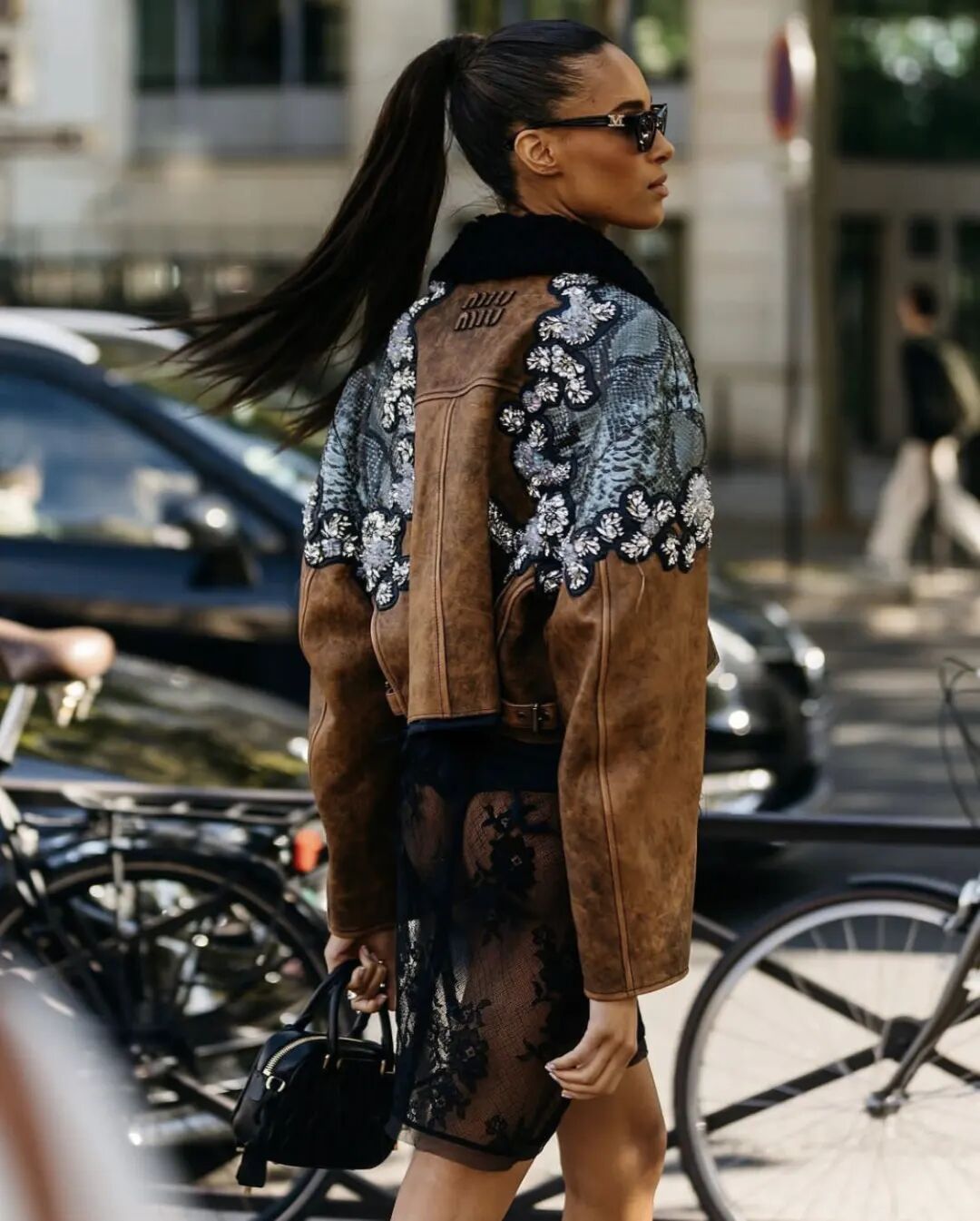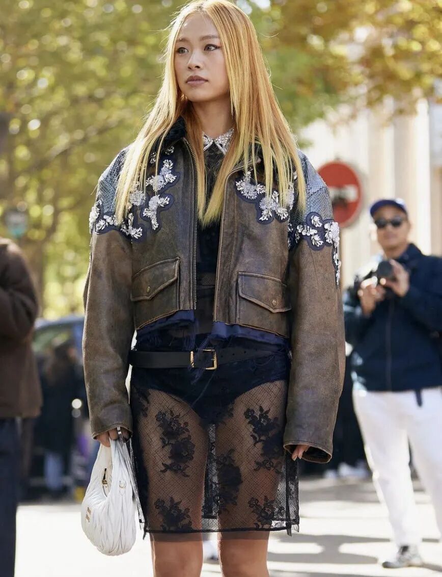 虽然她这件的真古着,但 Prada、Miu Miu 最近几季的复古皮衣,都可以做到这个效果。