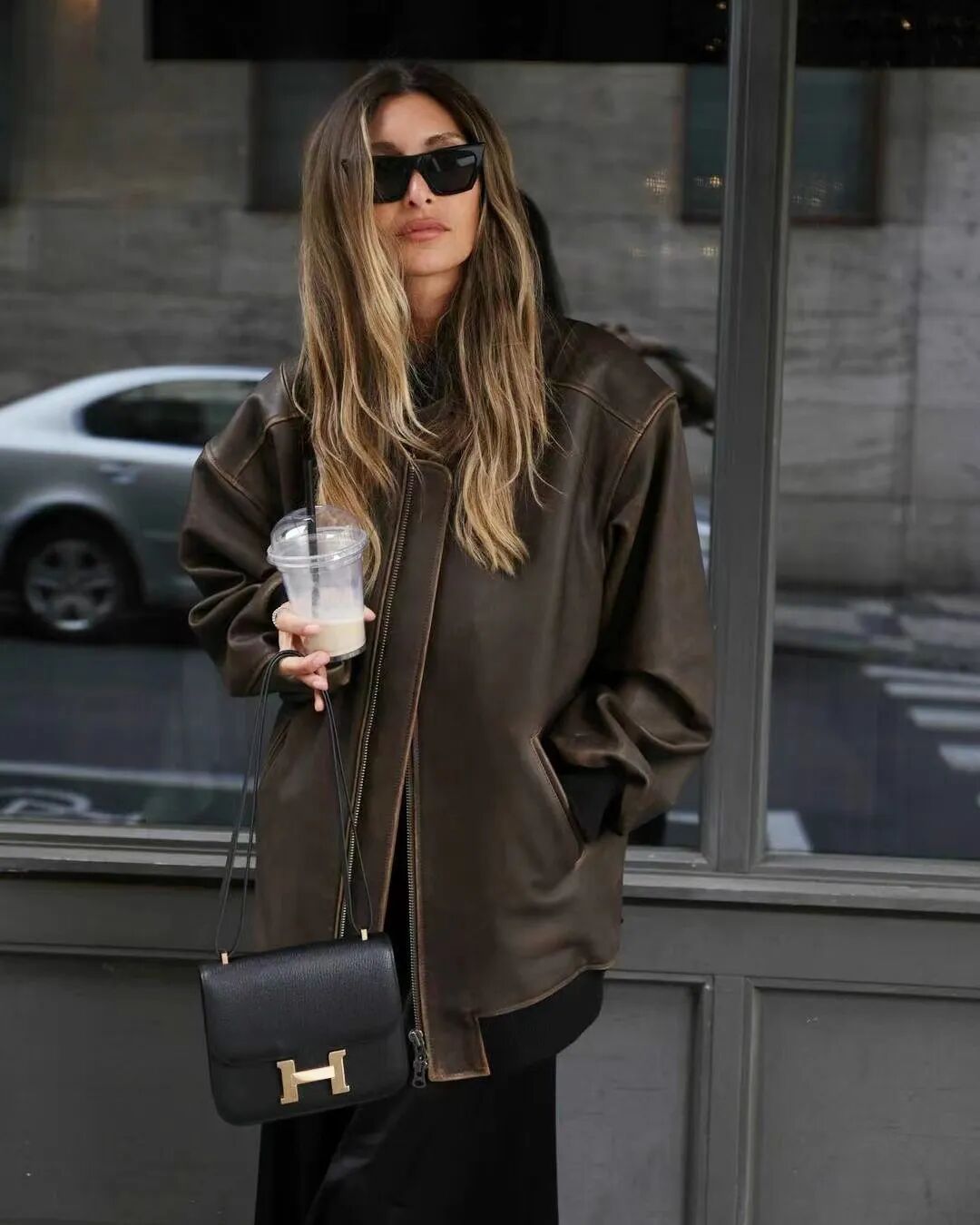 不过秋冬大热的皮夹克,可以看看这件 “大块头”。结合了飞行员夹克的 Oversize 造型和裹身设计,帅气中透着几分休闲、街头,同时呼应了 “老爸夹克” 的流行。