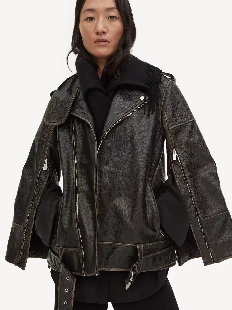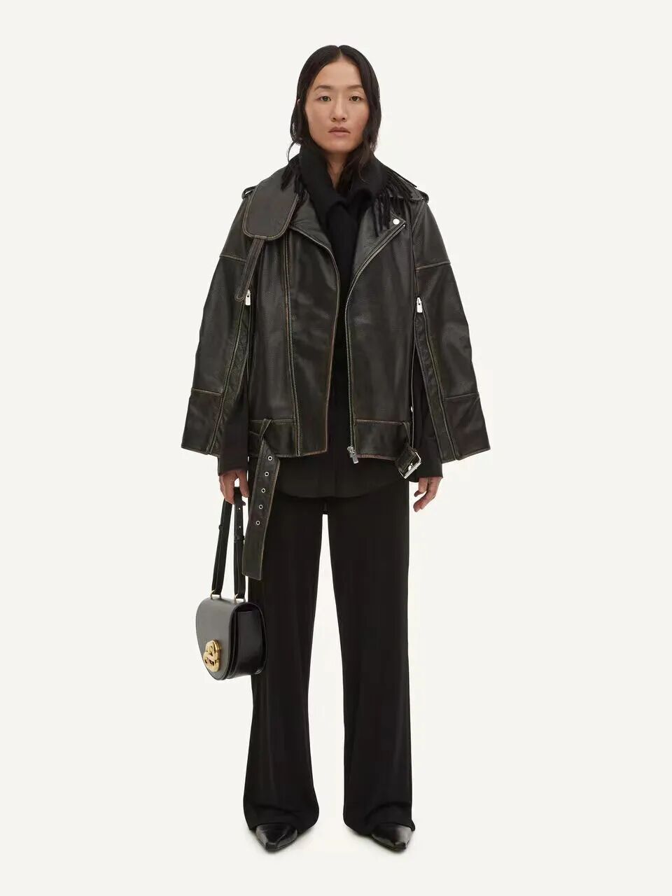 还有一款可拆卸领的皮衣,同样是带有经典机车夹克元素的设计,但衣身放宽,穿起来更自在。
