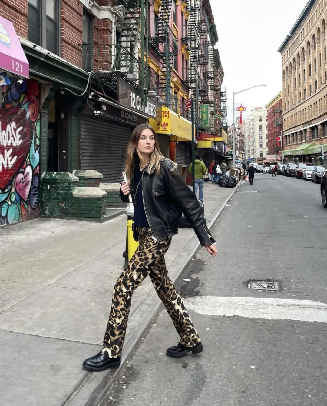 或是干脆复古到底,与醒目的豹纹印花裤、厚底皮鞋搭配,一副切尔西女孩的酷模样。