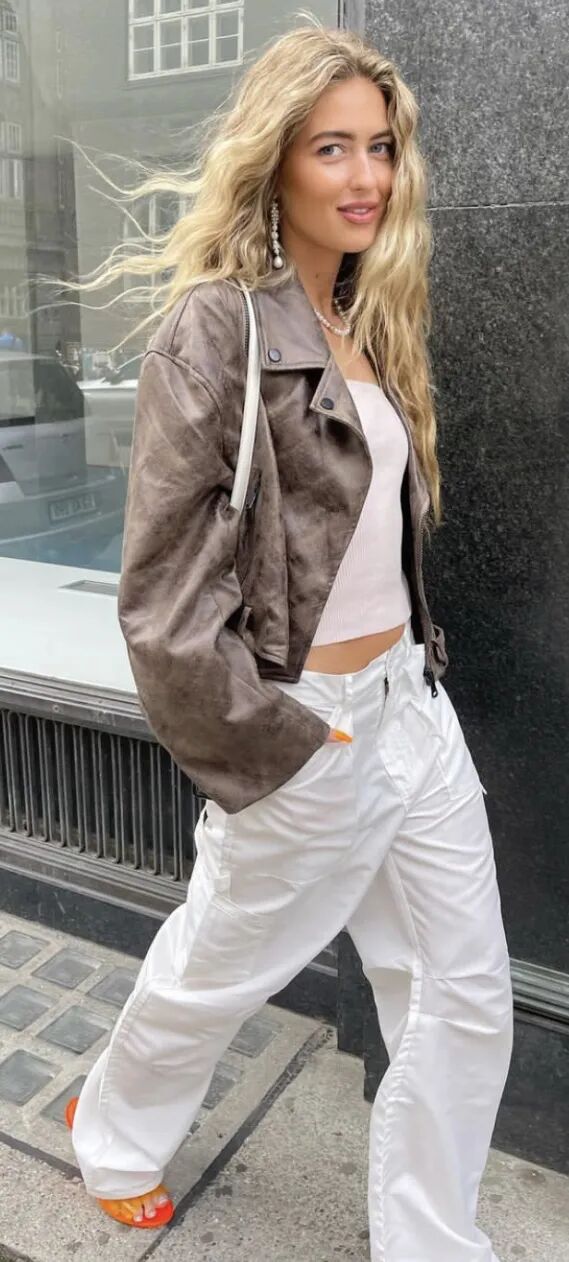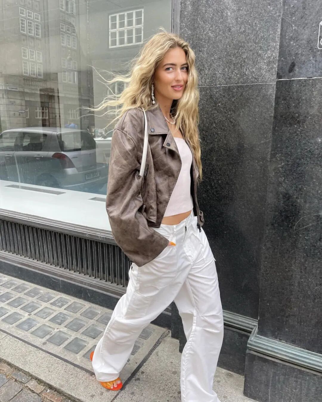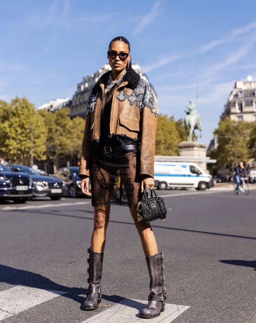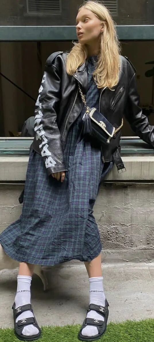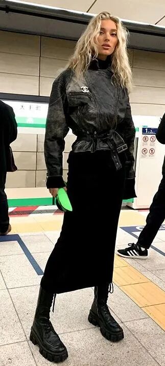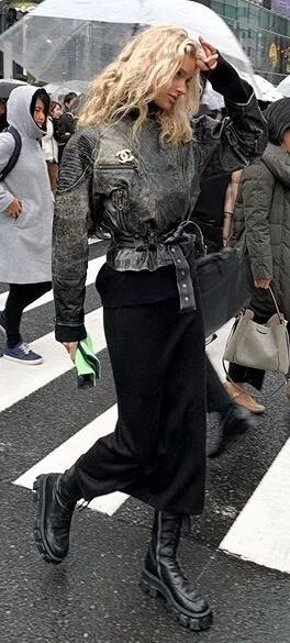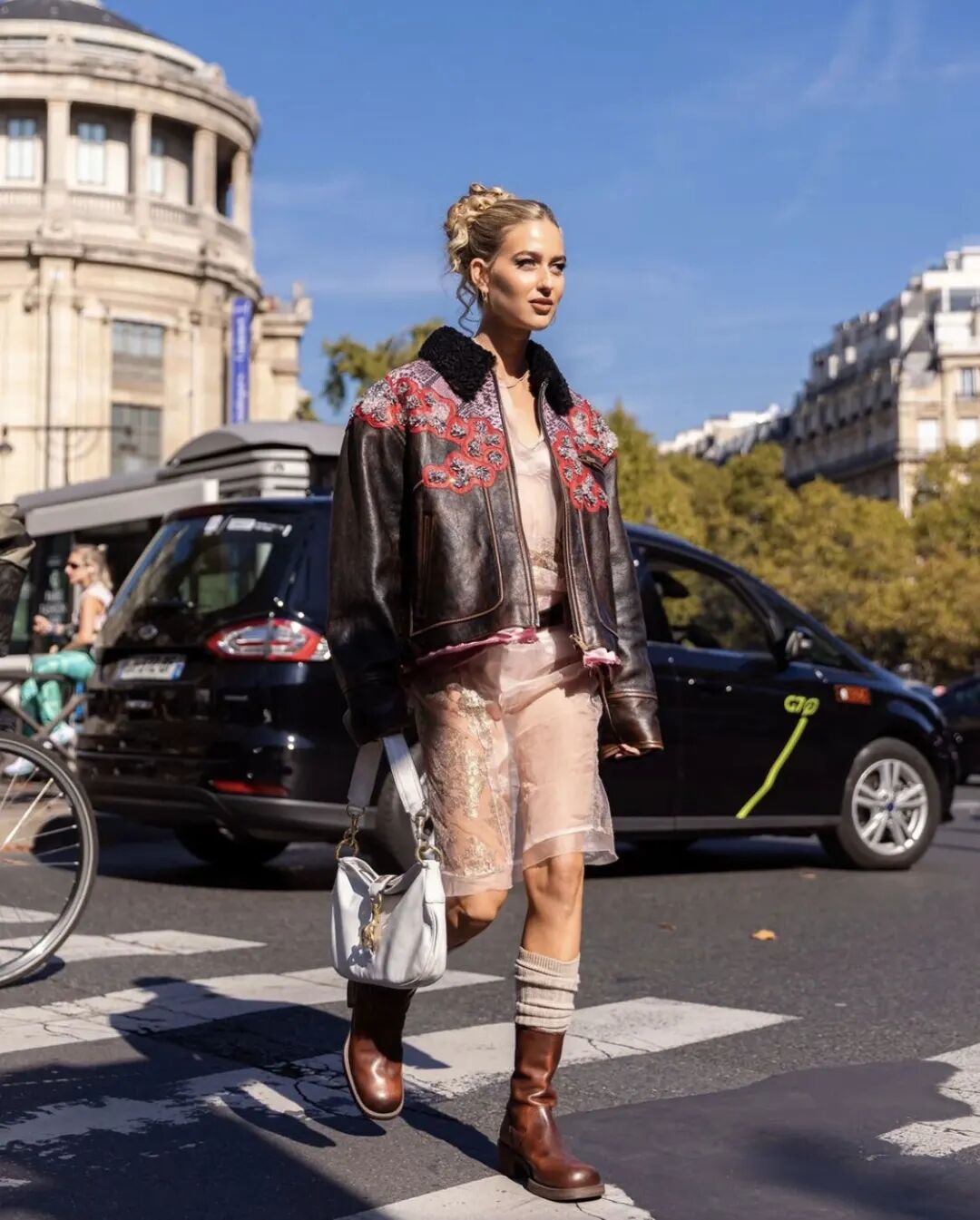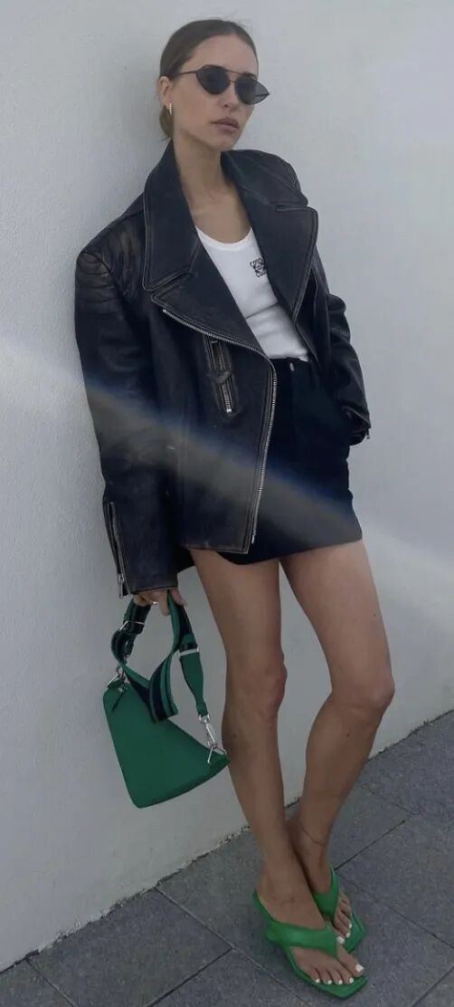 她还搭配过迷你裙、短袜配球鞋,一下子又让这个复古皮衣 look 多了几分轻松与休闲,也好时髦。