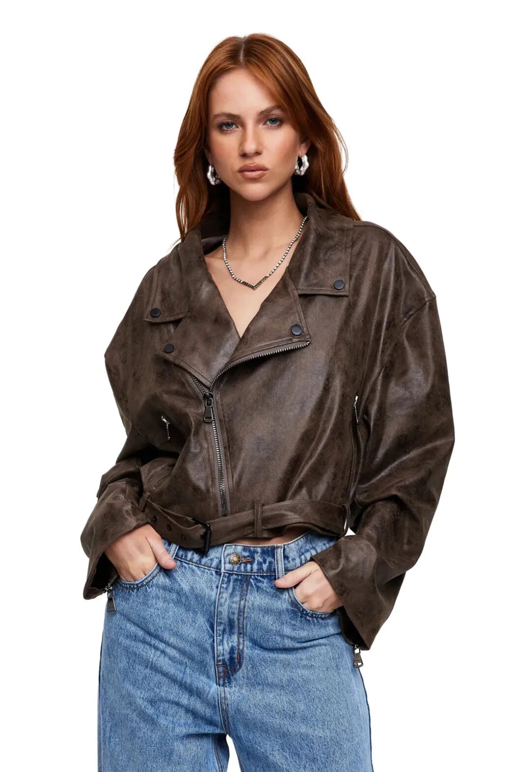 这件 Bella 夹克同样采用纯素皮革制作,运用工艺做成旧旧的质感,上身相当帅气,适合春秋季穿。