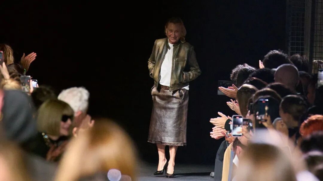 Miuccia Prada 在前不久 Miu Miu 2023 春夏时装秀的闭场造型,也穿了一套这样 “洗坏了” 的皮衣套装。