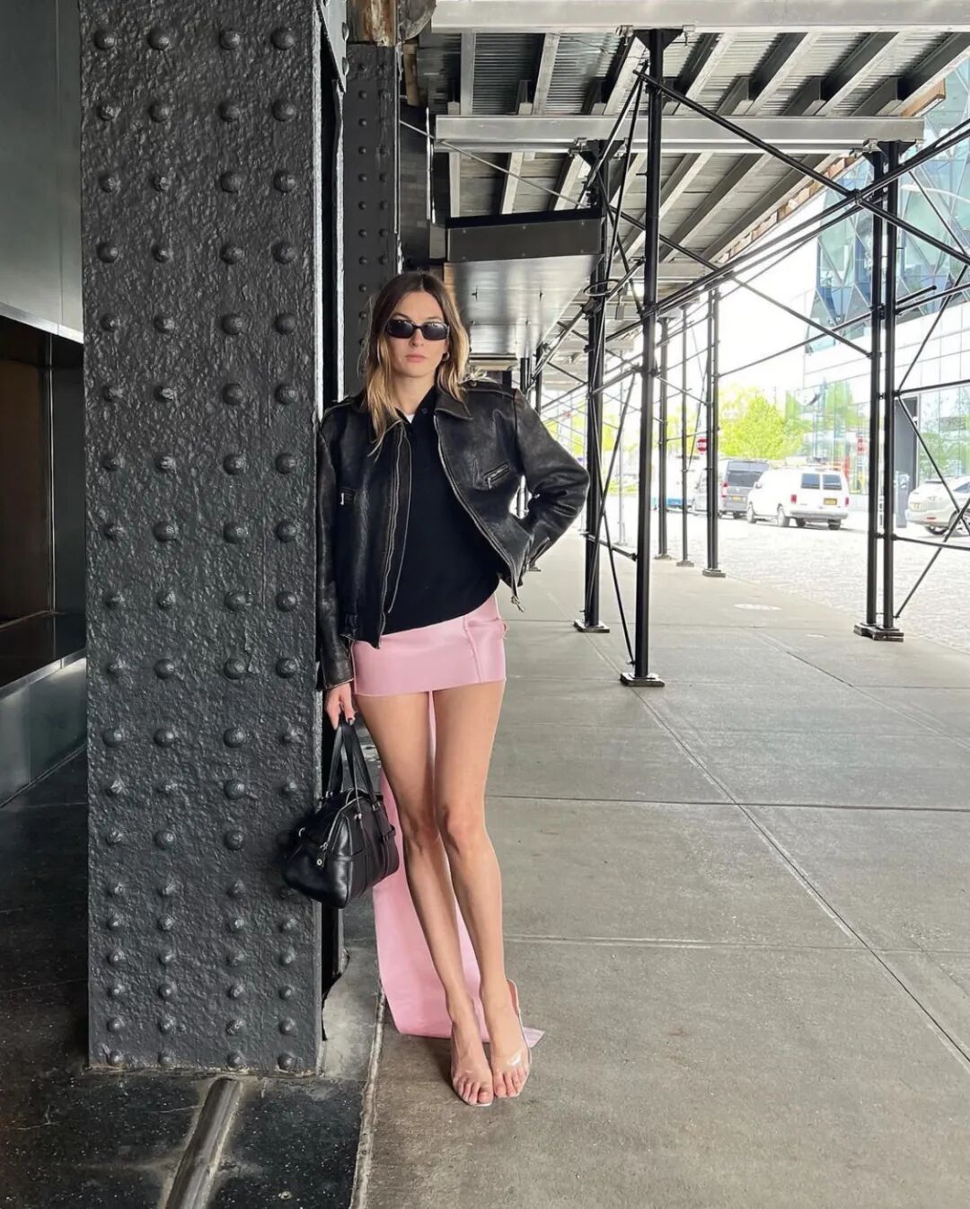 之前去参加品牌活动,搭配了同系列的粉色迷你半裙,与酷酷的做旧皮衣形成强烈的反差感,个性十足。