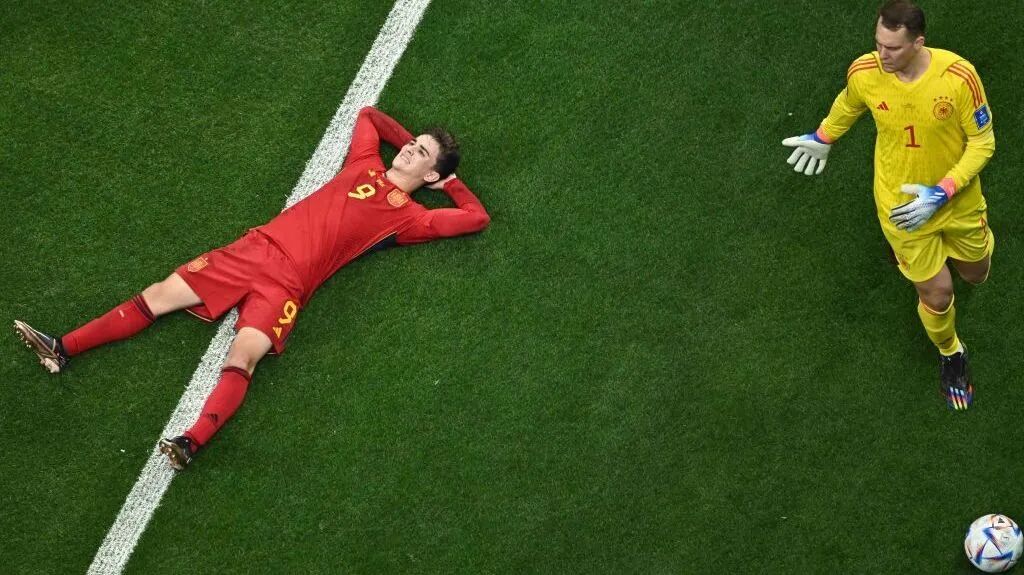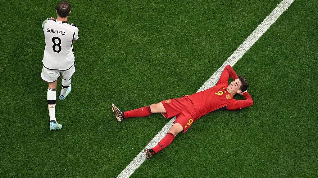 比赛最终以 1:1 结束,但是小将 Gavi 在一次拼抢中倒地,顺势躺在了草皮上,被摄影记者捕捉了下来,在微博上被网友们热传。
