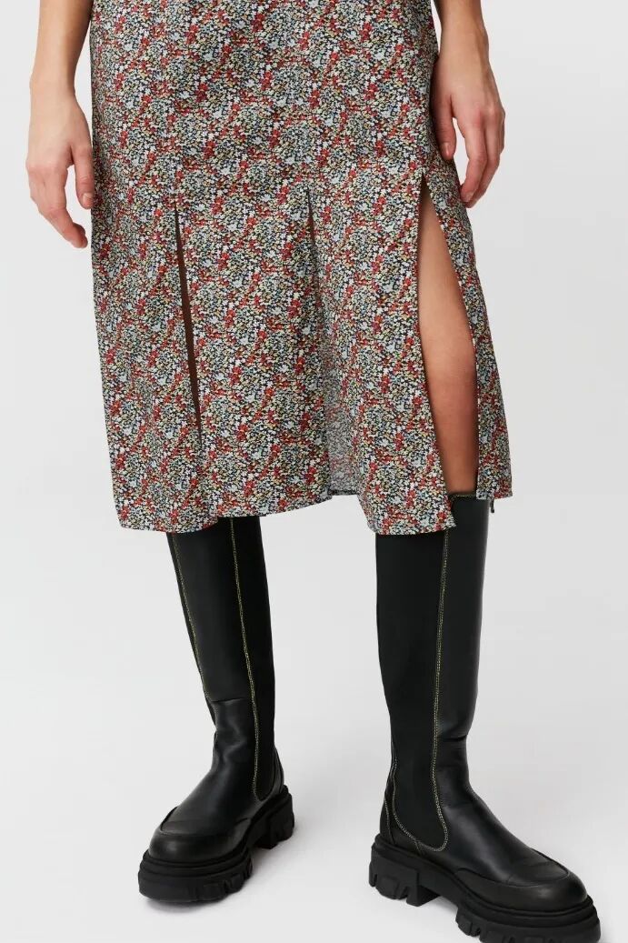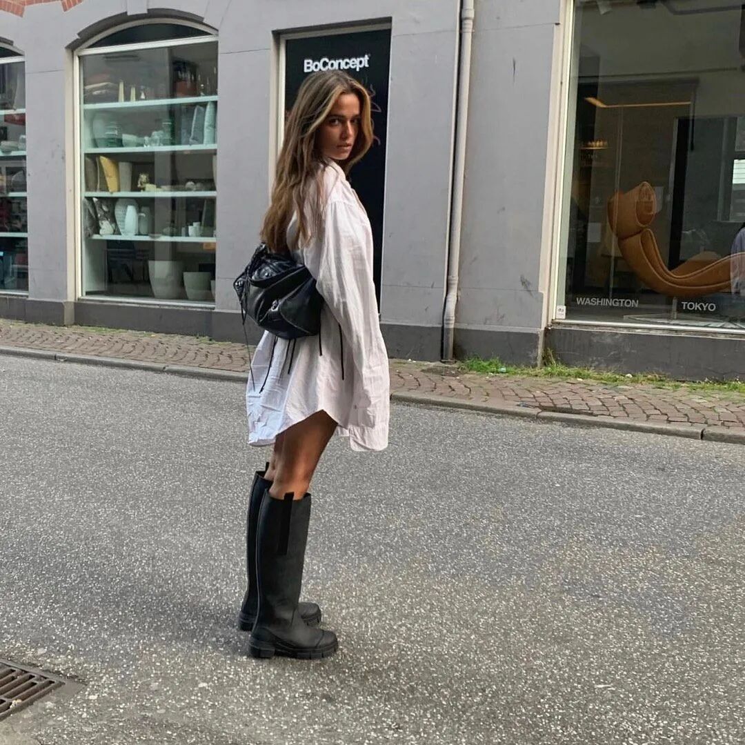 如同 Ganni 特色的碎花裙和娃娃领,正需要这类中性设计长靴的平衡。