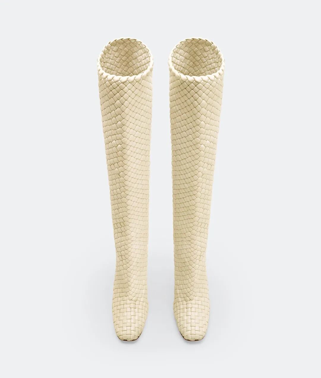 Bottega Veneta 换了 Matthieu Blazy 担任创意总监后,更加注重工艺与材质,不到一年时间已经推出了许多 “爆款单品”。这双 Canalazzo 编织过膝靴就是其中之一。