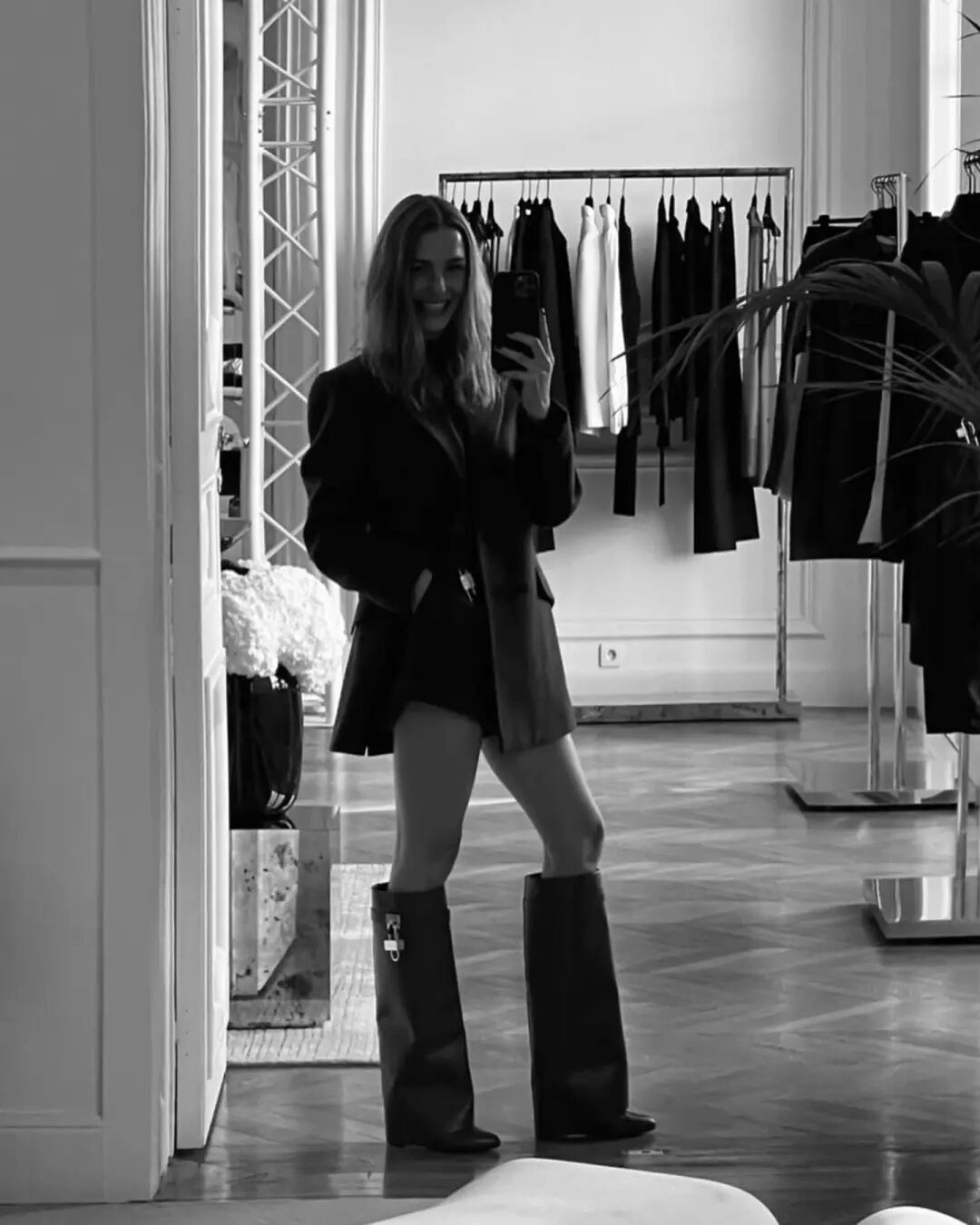 Givenchy 的 4G 锁扣鲨鱼靴自带气场,虽是尖头鞋,但因裤管的存在这双长靴游走在 Y2K 模样和职场风之间。