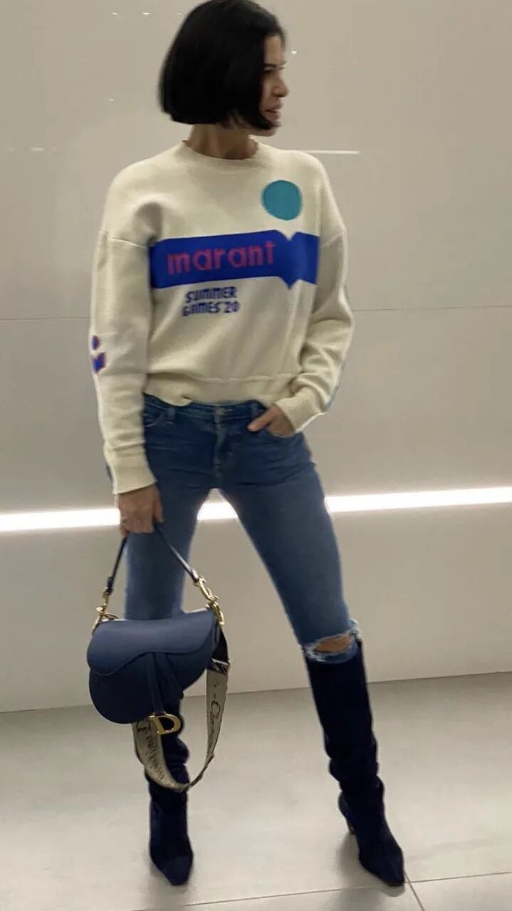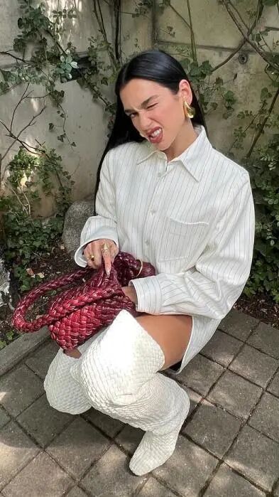 最早穿上的明星是啪姐 Dua Lipa,搭配了同品牌的皮革衬衫和 Kalimero 手袋(就是价格高达 6W+ 的那个)。靴子过膝,同色系搭配很干练。