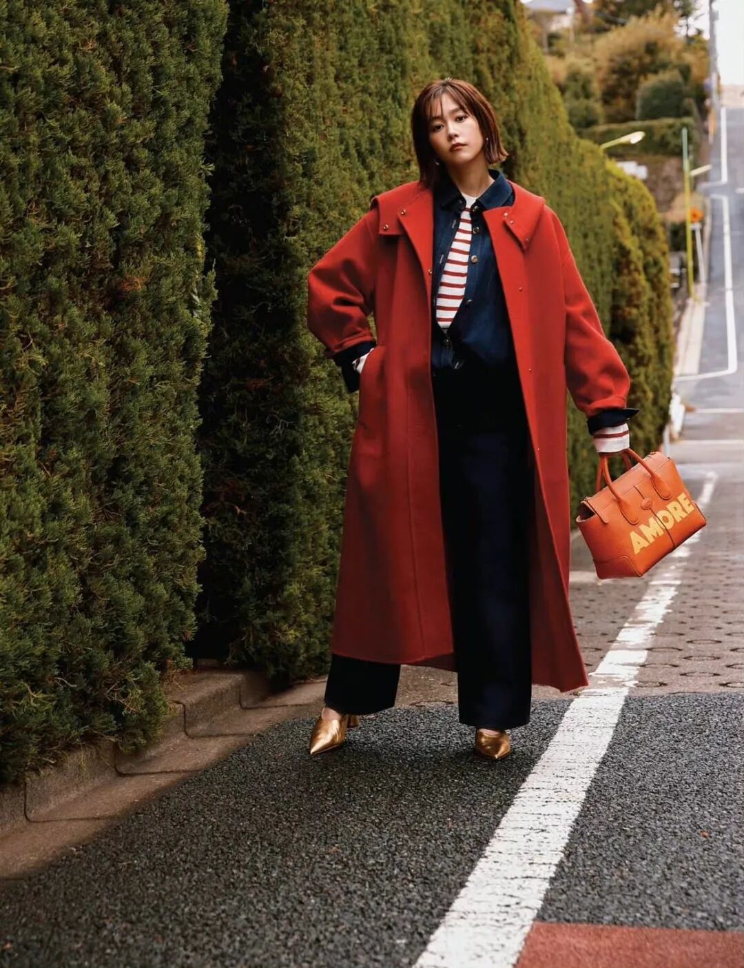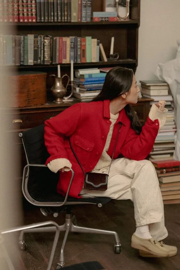 红色系大衣也是个不错的选择,搭配紧身裤长筒靴是成熟法式风,搭配条纹衫牛仔裤就很日式小清新。
